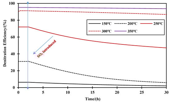Figure 15 shows the variation of denitration efficiency with time at sulfur-containing exhaust gas conditions. From Figure 15, after the introduction of SO2 into the reactor, the denitration efficiency decreases with time when the exhaust gas temperature is lower than 300 °C. Contrariwise, when the exhaust gas temperature is higher than 350 °C, the denitration efficiency does not change substantially. Furthermore, when the exhaust gas temperature is 200 °C and 250 °C, the introduction of SO2 greatly influences the catalyst activity and the denitration efficiency, which decreases by 26% and 25%, respectively, after t = 30 h. This indicates that the catalyst sulfate passivation is more serious at lower exhaust gas temperatures and SO2 has a little impact on the catalyst activity when the exhaust gas temperature is higher than 300 °C.