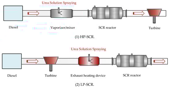 Compared with vehicle diesel engines, the marine diesel engine’s SCR system is divided into a high-pressure SCR system (HP-SCR) located in front of the turbine and a low-pressure SCR system (LP-SCR) placed at the back [], which are shown in the Figure 16. Since the exhaust gas in the exhaust pipe drives the turbine to work, the temperature of the exhaust gas before and after the turbine differs by 50~175 °C—so the high-pressure SCR system in front of the turbine can make full use of the higher exhaust gas temperature and also improve its activity. At the same time, the high-pressure SCR system has a high working pressure, and its absolute pressure is several times higher than the low-pressure SCR system, which is equivalent to reducing the volume flow rate or linear velocity of the treated exhaust gases and increasing the SCR reaction time. Therefore, under the same design requirements, the high-pressure SCR system has a more compact structure and higher efficiency making it more suitable for the high-power low-speed diesel engines.