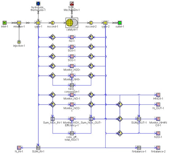 Since the marine diesel engines burn sulfur-containing fuels (sulfur content more than 3.5% m/m), the temperature of the exhaust gas remains low (below 200 °C) and the SOx concentration of the exhaust gas goes higher (more than 700 ppm) [,]. In addition, the SCR system working temperature will certainly be in the range of the ammonium hydrochloric acid’s dew point. Therefore, the influence of sulfate and nitrate on the denitration efficiency must be considered when the engine matches the SCR system. However, the marine diesel engine has high power (MW grade) and large fuel consumption, which makes it difficult to carry out a larger number of reliability endurance tests. Hence, it is necessary to build a simulation model of the marine diesel engine SCR system to study the influence of the ammonium salt passivation reaction on the SCR system.