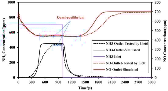 This section explores the simulation verification of the SCR denitration reaction process, which was carried out by taking into consideration the denitration reaction test of the vanadium-based catalysts by Luca Lietti et al. [,]. Among them, the test time was set at 3000 s and the NH3 concentration was 1000 ppm at the reactor inlet. In addition, NO and O2 concentration were 700 ppm and 1%, respectively. Moreover, Helium (He) was the equilibrium gas, the initial exhaust gas temperature was 220 °C, and the supply of NH3 was stopped after t = 1000 s. The test and the simulation results are shown in Figure 19.