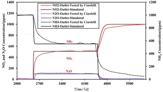 Based on the denitration reaction of the vanadium-based catalysts and the reaction of ammonium nitrate formation by Cristian Ciardelli et al. [], the simulation verification of the ammonium nitrate formation/decomposition reaction process was carried out in this section. The test time was 6000 s and the reaction temperature was 175 °C. In addition, the equilibrium gas was N2 and the concentrations of NH3, NO, NO2, O2, and H2O were 1000 ppm, 750 ppm, 250 ppm, 2%, and 1%, respectively. Moreover, NH3 was introduced into the exhaust gas in the beginning and stopped at t = 6500 s while NOx was introduced at t = 3000 s. The test and simulation results are shown in Figure 20.