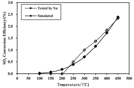 As shown in Figure 21, the experimental values of SO2 conversion efficiency at different temperatures are consistent and agree well with the trend of the simulated values. When the temperature is between 250 and 450 °C, the experimental value of SO2 conversion efficiency is slightly larger than the simulated value because during the experiment, a small amount of adsorbed SO2 reacts with O2 gas molecules.