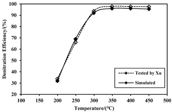 Experimental and simulation results of denitration efficiency at different temperatures.