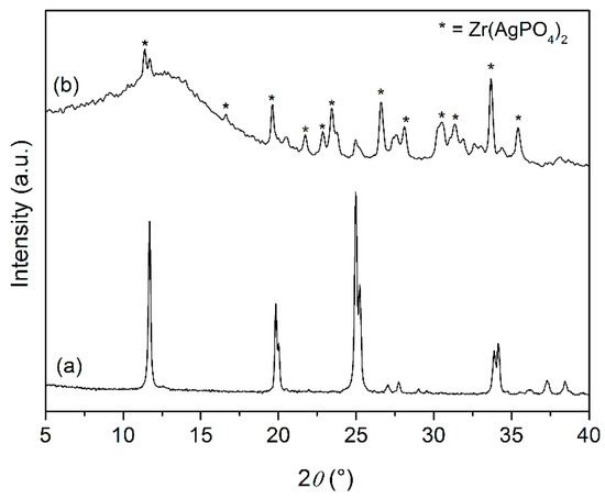 XRD patterns of α-ZrP·H2O (a) and ZrPAg (b). Peaks labelled with an asterisk refer to the Zr(AgPO4)2 phase. a.u. = arbitrary units.