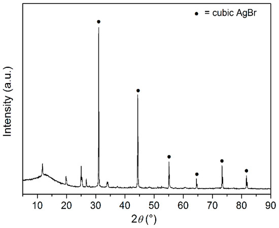 XRD pattern of ZrP/AgBr. Peaks labelled with black dots refer to the cubic AgBr phase.