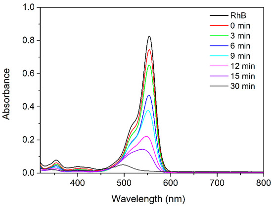 The half-life of RhB (t1/2) was 7.92 min, while the percentage of chromophore cleavage was around 91% after 30 min.