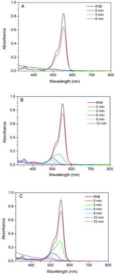 The temporal evolution of the UV-Vis spectra of RhB in the three experiments with ZrP/AgBr are shown in Figure 9. An ipsochromic shift of λm was observed, and an almost complete disappearance of the band in the visible region (chromophore cleavage > 90%) occurred within a maximum of 6 min, 12 min and 15 min in the presence of 1.1 mg, 0.73 mg, 0.45 mg AgBr/mL RhB, respectively.