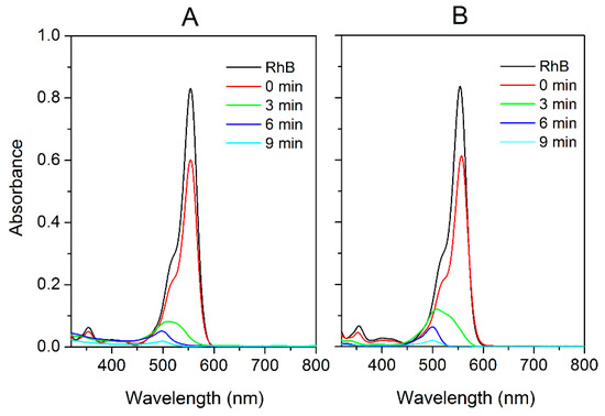 UV-Vis spectra collected during the second (A) and third (B) test carried out with ZrP/AgBr (1.1 mg AgBr/ mL RhB).