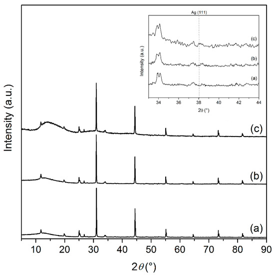 XRD patterns of the ZrP/AgBr photocatalyst collected after the first (a); the second (b) and the third (c) catalytic test.