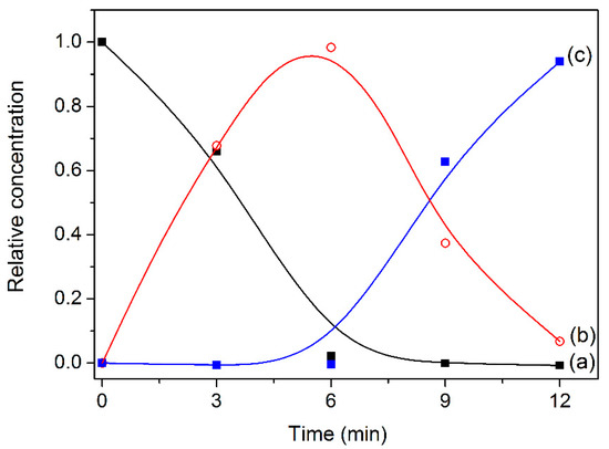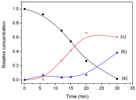 Relative concentration of RhB (a); de-ethylated species (b) and cleaved species (c) as a function of time, calculated according to Equation (2), for the catalytic test with ZrP/AgBr.