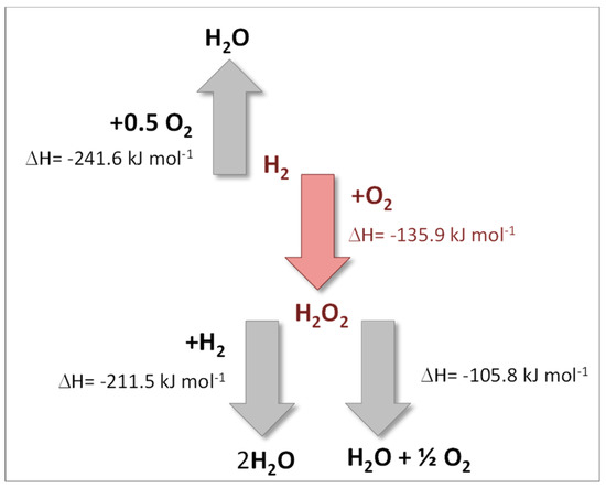 H2O2 direct synthesis can potentially halve the cost with respect to the anthraquinone commercial process, resulting in a much lower environmental impact, also due to the possibility to avoid chlorine for oxidation chemistry [1,4]. In addition, the direct synthesis reaction has the potential to produce inexpensive H2O2 at the mid-scale in geographically distributed facilities, because such facilities would have much lower capital and operating costs than Riedl-Pfleiderer plants with comparable dimension [5,6]. Nevertheless, no alternative process for H2O2 direct synthesis has yet been marketed, despite several published patents [2,7,8,9,10,11] and literature papers [10,12,13,14,15,16,17,18,19,20,21,22,23,24,25]. Indeed, selectivity is still far from being high and must be significantly improved for a successful industrial exploitation. Indeed, water is the most thermodynamically favoured product (as shown in Figure 2) and the H2-O2 gas mixtures are explosive in a very broad range of compositions (4–96%), posing severe limitations to the practicability of the process under safe conditions.