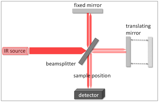 The experiments that are presented and discussed in this review have been carried out mainly in the mid IR frequency range, between approximately 700 and 4000 cm−1, in which most of the molecular vibrations absorb light. Currently, Fourier transform infrared spectrometers (FTIR) are employed, and such instruments are fairly cheap and widespread in most analytical and research laboratories. In FTIR instruments a Michelson interferometer processes the collimated IR light before focusing it onto the sample and further collects and detects the resulting beam. According to Figure 4, the IR beam is split into two equal beams, the former is refracted in the direction of a fixed mirror, whereas the latter is transmitted to a movable mirror.