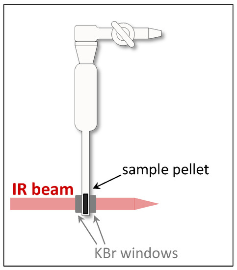 Most of the spectroscopic studies reported in the literature have been performed in transmission mode. Generally the setup consists in a self-sustaining pellet of the powered catalyst or of a mixture with IR transparent KBr, placed inside a cell allowing to work in controlled atmosphere, and collect in situ IR spectra [39,40]. A schematic picture of an example of transmission mode is shown in Figure 5. There is also the possibility to follow spectroscopically the catalytic reaction and to collect operando IR spectra.