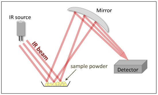 Diffuse reflectance (DRIFTS) mode, where an IR beam is focused on the powdered samples and the scattered light is collected by a parabolic mirror.