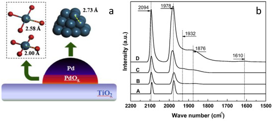 (a) Structural model of the Pd/TiO2 catalyst. (b) In situ DRIFTS of CO adsorption over different catalysts at room temperature in an Ar flow (50 mL/min): A: 1.0% Pd, B: 2.0% Pd, C: 3.0% Pd, and D: 5.0% Pd. Reprinted from J. Catal., 321, L. Ouyang, P. Tian, G. Da, X. Xu, C. Ao, T. Chen, R. Si, J. Xu, Y. Han, The origin of active sites for direct synthesis of H2O2 on Pd/TiO2 catalysts: Interfaces of Pd and PdO domains, 70–80, Copyright (2018), with permission from Elsevier.