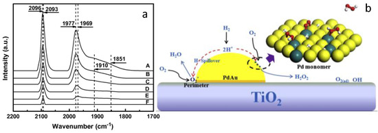 High dispersion of Pd sites as well as incremented Pd0 content can boost the hydrogenation rate of hydrogen peroxide, however lowering H2O2 selectivity. Theoretical studies revealed the beneficial effect of Pd monomers, which favour H2O2 formation and, at the same time, avoid the O–O bond dissociation [87]. Ouyang et al. studied both H2O2 direct synthesis and side reactions over different Pd–Au/TiO2 catalysts and discovered that the productivity of hydrogen peroxide increased by decreasing the Pd/Au ratio [86]. The in situ DRIFT spectra of CO adsorbed on Pd and Pd–Au catalysts, are reported in Figure 9a. Different metallic Pd sites were observed on the monometallic catalyst, and assigned to linear CO adsorbed on low coordination Pd atoms, presumably corners or edges of the nanoparticles (the band at 2096 cm−1) [88], and to bridged and multibonded CO on Pd ensembles formed by two or three adjacent atoms (the bands at 1977, 1910, and 1851 cm−1) [83].