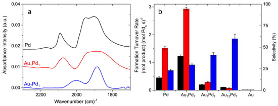 The promotional effect of gold was previously reported for Pd–Au/SiO2 catalysts by XPS measurements combined with in situ DRIFT spectroscopy of adsorbed CO. These studies proved the occurrence of surface and electronic modifications of Pd when alloyed with Au atoms, leading to enhanced reactivity and selectivity for the H2O2 direct synthesis [89]. Very recently, Flaherty et al. investigated Pd and AuxPd1 nanoparticles with similar size (7–11 nm) to understand the effect of alloying Pd with Au [90]. In particular, the aim was to find better explanations for the high H2O2 selectivity of these bimetallic catalysts by measuring the steady-state formation rates of both H2O2 and H2O with respect to the pressure, the temperature, and the nature of the solvent. The authors indicated that H2O2 is produced by sequential surface proton-electron transfers. Interestingly, an increase of the Au:Pd ratio corresponds to different and simultaneous increases in the activation enthalpies related to the H2O2 and H2O production. These changes are due to the occurrence of electronic changes induced by the addition of gold to palladium and are responsible for the improved selectivity towards H2O2 reported for AuPd bimetallic catalysts. The Pd and AuxPd1 were characterized also by FTIR spectroscopy, and the results are reported in Figure 10a.