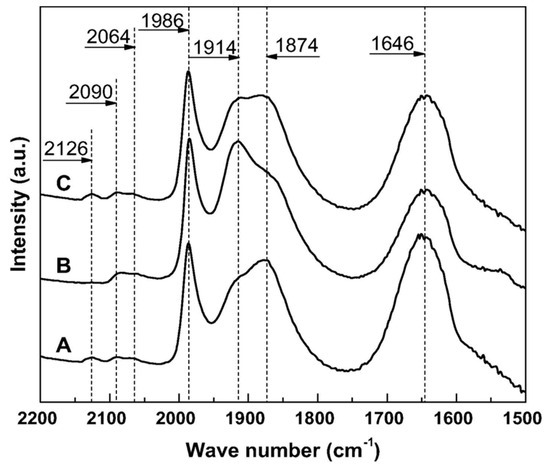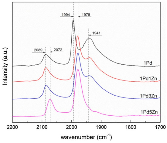 The authors bestowed the marked improvement of catalytic activity to geometric and electronic effects induced by Zn addition. XPS results indicated that at increasing Zn loadings the number of surface contiguous Pd sites decreased and, at the same time, an increase of the number of isolated Pd sites was observed. Indeed, Zn is able to disassemble the surface Pd agglomerates, thus enhancing the amount of Pd islands and single atoms [53]. The catalysts were reduced at 300 °C by using a 10% H2/N2 mixture for 60 min, and then cooled in a N2 atmosphere before CO interaction at 30 °C for 15 min. The DRIFT spectra collected on monometallic Pd and on bimetallic PdZn catalysts are shown in Figure 11.