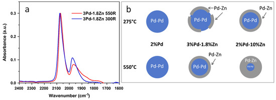 Based on the characterization results, the authors proposed simplified models of the catalyst structure, which are shown in Figure 12b. In particular, the bimetallic nanoparticles of the 3%Pd–1.8%Zn catalyst have a Pd core with surface Zn atoms upon reduction at 275 °C, and the surface PdZn film possesses an intermetallic alloy structure, based on the high intensity of the band related to linear-bound CO bands. An increase in the surface PdZn intermetallic alloy, with few residual Pd ensembles, occurs at 550 °C, while the nanoparticle core is Pd-rich. This is due to the limited amount of Zn atoms interacting with Pd, resulting in the impossibility to form a fully intermetallic PdZn alloy nanoparticle at such temperature [94].