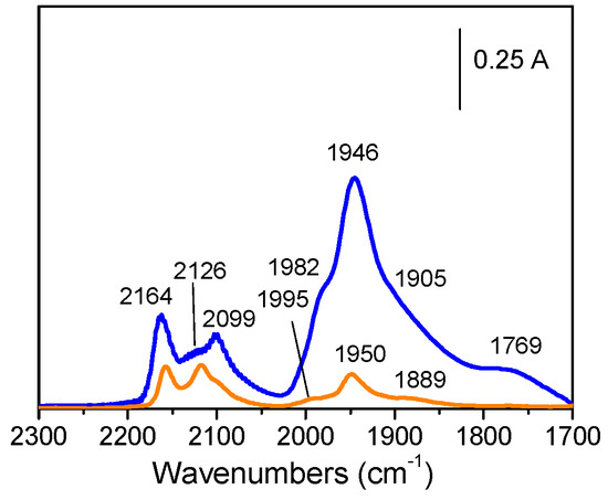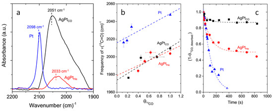 FTIR experiments of adsorbed 12CO were then performed on the monometallic Pt catalyst and on the AgPt catalyst pretreated in 12CO or He (Figure 14a). Firstly, it has to be recalled that 12CO does not adsorb on the Ag sites under the adopted experimental conditions. The bands of adsorbed 12CO on AgPtCO (black curve) and AgPtHe (red curve) octahedra differ significantly in both position and intensity, due to modifications of surface structure of the AgPt octahedral, because the FTIR spectra were obtained by submitting the same sample pellet to in situ CO and He pre-treatments. Conversely, the band at 2098 cm−1 was assigned linear carbonyl species adsorbed on single Pt atoms exposed at the surface of the nanoparticles [96] and on Pt(111) [81]. The positions of the bands related to linearly adsorbed 12CO are significantly red-shifted at 2051 cm−1 for AgPtCO and at 2033 cm−1 in the case of AgPtHe, revealing different extents of electron exchange between the 12CO probe. Such a feature can be ascribed to lower dipole–dipole coupling between the 12CO molecules due to the lower coverage of linear carbonyls, which results in a red-shift of the 12CO band [81]. In addition, the intensity of the peaks related to the AgPt octahedra pre-treated with CO was about six times the intensity observed for AgPtHe, which pointed out that the 12CO pre-treatment was able to extract a much bigger amount of exposed Pt sites at the surface of the AgPt octahedra with respect to the treatment in He. Moreover, the difference in position of about 20 cm−1 for AgPtCO and AgPtHe was in agreement with the literature on CO adsorbed on well-coordinated Pt terraces and on under-coordinated Pt edges [96].