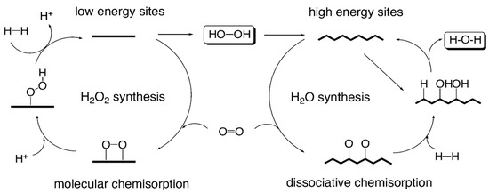 The direct synthesis reaction can be considered as a dream reaction involving molecular H2 and O2, in which the formation of H2O2 takes place upon proton−electron transfer to O2 and *OOH intermediates. Conversely, the formation of H2O implies the O–O bond cleavage of the surface *OOH species [3]. As a matter of fact, H2O2 selectivity is ruled by the competitive O–H bond formation and O–O bond cleavage.
