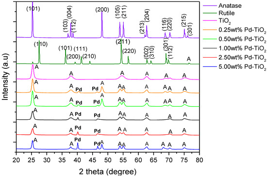 X-ray diffraction (XRD) diffractograms of photocatalyst doped with Pd. XRDs overlapped for comparison. A = anatase, Pd = palladium.
