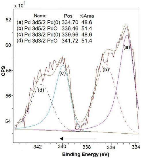 The 1.0 wt% Pd–TiO2 photocatalyst was analyzed using the XPS technique. Figure 4 shows the XPS for Pd(0) and PdO. In each case, one can see double peaks as follows: (a) Pd (0) 3d5/2, with 334.70 eV and 3d3/2 at 339.96 eV binding energies, (b) PdO 3d5/2 with 336.46 eV and 3d3/2 at 341.72 eV. This yields a consistent 48.6% of Pd (0) and 51.4% of PdO, at the two binding energy ranges considered.