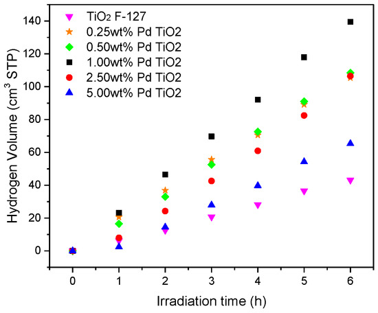 Figure 6 reports the influence of Pd on TiO2 in terms of cumulative hydrogen volume.