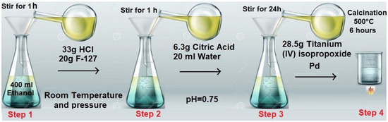Palladium was used as co-catalyst to dope the structure of the TiO2 photocatalyst. This metal enhances the hydrogen production, as compared to the undoped mesoporous TiO2. Nobel metal crystallites reduce the band gap and facilitate electron capture [29]. As a result, Pd reduces the recombination between holes and electrons, promoting better photocatalytic water-splitting performances [30].