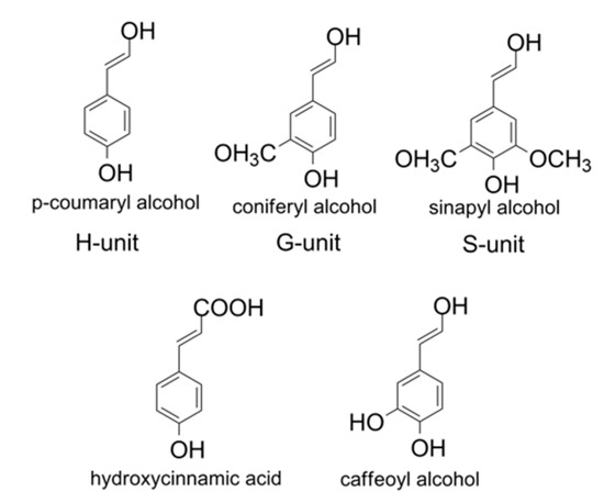 - Ralph, J. Hydroxycinnamates in lignification. Phytochem Rev. 2010, 9, 65–83. [Google Scholar] [CrossRef]
