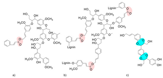 Representation of lignin polymer structures: (a) Wild-type lignin; (b) engineered lignin with high levels of ferulic acid; (c) recently discovered C-lignin. Pink color marks indicate ester linkages. Blue color marks indicate ether linkages. Adapted with permission from [27]. Copyright 2016, Elsevier.