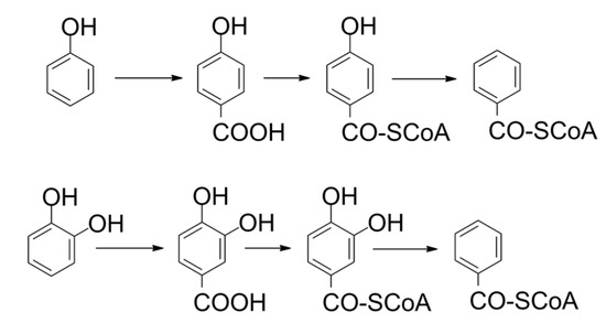 - Fuchs, G.; Boll, M.; Heider, J. Microbial degradation of aromatic compounds—From one strategy to four. Nat. Rev. Microbiol. 2011, 9, 803–816. [Google Scholar] [CrossRef] [PubMed]