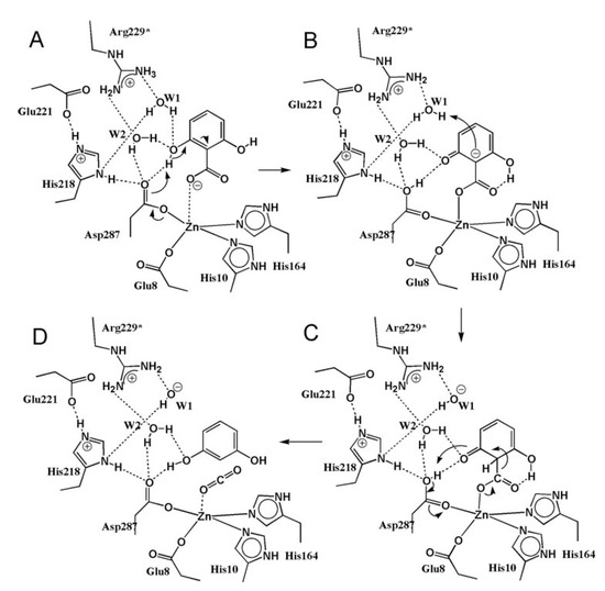 In recent reviews, Chaiyen and coworkers [36] have summarized the most important biotransformations of plant derived phenolic compounds through esterification, decarboxylation, amination, halogenation, and hydroxylation reactions, while Sieber and coworkers have highlighted the importance of several decarboxylase enzymes to produce valuable chemicals from renewable resources [37]. Other relevant reviews dealing with enzymatic carboxylation reactions using CO2 or HCO3− can be found in the literature [38,39,40,41]. As mentioned before, in this review, we will focus on the reactivity of decarboxylase enzymes converting hydroxyaromatic compounds into phenolic acids, including recent advances in crystal structure determination and enzyme kinetics.