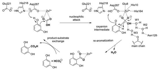 - Goto, M.; Hayashi, H.; Miyahara, I.; Hirotsu, K.; Yoshida, M.; Oikawa, T. Crystal Structures of Non-oxidative Zinc-dependent 2,6-Dihydroxybenzoate (γ-Resorcylate) Decarboxylasefrom Rhizobium sp. Strain MTP-10005. J. Biol. Chem. 2006, 281, 34365–34373. [Google Scholar] [CrossRef] [PubMed]