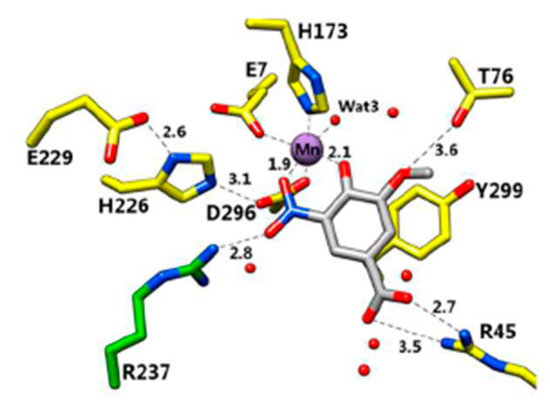 Zhu and coworkers have measured a KM of 24.9 ± 4.13 mM and kcat of 46.8 ± 0.01 min−1 for the purified enzyme catalyzing the carboxylation of catechol to 2,3-dihydroxybenzoate. Table 6 shows the scope of the carboxylation reaction carried out by using the purified enzyme under the following experimental conditions: 96 μg of protein was suspended in 1 mL containing 20 mM of substrate and 3 M of KHCO3. Cells were incubated at 40 °C for 20 min.