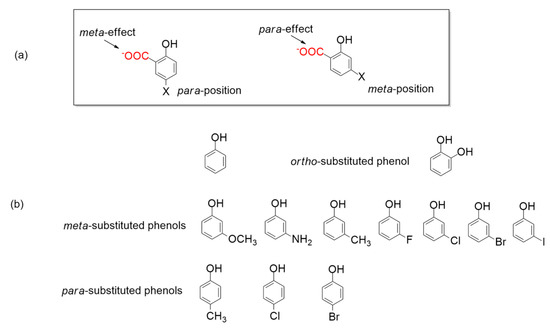 Based on the abovementioned considerations, it will be assumed that the stoichiometry of the carboxylation reactions analyzed in this review is written according to Figure 7c. The benzoate anion derivatives or hydroxycinnamate derivatives are the reaction products also for carboxylation reactions analysed in Section 5, Section 8 and Section 9. Recovery of the corresponding acid derivative requires subsequent acidification of the reaction medium.
