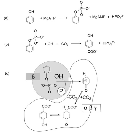 It is worth mentioning that in several enzymes classified as “assimilatory carboxylases” [46], the benzoate derivative is used by microorganisms as a source of carbon and energy. In these cases, the functionalisation of phenols with the carboxyl group increases the molecular polarity and, consequently, increases the water solubility of the carbon source [47].
