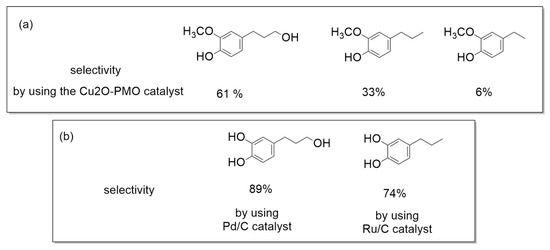 Concerning item i), Wilkerson and coworkers [28] succeeded in engineering poplar trees to produce high level of ferulic acid, increasing the ferulate ester groups into the lignin polymer (Figure 3b). The high degree of ester linkages allowed depolymerisation of the modified lignin under mild alkaline conditions. Moreover, unusual catechyl lignin (C-lignin) (Figure 3c) found in seed coats of Vanilla planifolia and various plants of the genus, Melocactus, has been converted by hydrogenolysis to produce catechyl-type monomers in a near-quantitative yield with a selectivity of 90% to a single monomer [29].