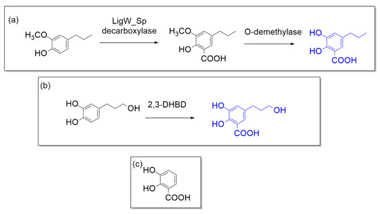 - He, Z.; Wiegel, J. Purification and characterization of an oxygensensitive, reversible 3,4-dihydroxybenzoate decarboxylase from Clostridium hydroxybenzoicum. J Bacteriol. 1996, 178, 3539–3543. [Google Scholar] [CrossRef] [PubMed]