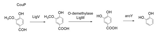 - Peng, X.; Masai, E.; Kasai, D.; Miyauchi, K.; Katayama, Y.; Fukuda, M. A Second 5-Carboxyvanillate Decarboxylase Gene, ligW2 Is Important for Lignin-Related Biphenyl Catabolism in Sphingomonas paucimobilis SYK-6. Appl. Environ. Microb. 2005, 71, 5014–5021. [Google Scholar] [CrossRef] [PubMed]