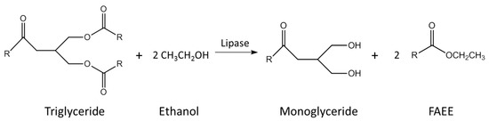 Considering the biofuel synthesis and taking into account the available technology, the conventional biodiesel production described by the standard EN 14214, present as the main drawback the glycerol generated as byproduct, which is a 10% by weight of the total of biodiesel produced [19]. For instance, the Lurgi’s biodiesel fabrication technology is based on two successive transesterification reactions of TG with methanol to form FAME and glycerol in the presence of an alkaline catalyst [20]. At the end of the reaction, the mixture is neutralized by adding hydrochloric acid. A subsequent counter-current washing step removes by-product components and gives a ‘‘ready for use’’ biodiesel after final drying step. The washing step of biodiesel to eliminate glycerol residues, that must be less than 0.02%, provides an additional complication. On one hand, it requires processing with high energy costs. On the other hand, it requires a high consumption of water. A possible solution to this problem is the production of a new type of biodiesel that integrates glycerol in the form of a soluble derivative. Thus, the production of glycerol is avoided, and, at the same time, the atomic performance of the process is increased, since all the reactive raw materials are transformed into a biofuel [21,22]. In this sense, our Research Group has accomplished the transesterification of triglycerides with ethanol to produce monoglycerides (MGs) as soluble derivatives of glycerol employing different lipases as catalysts. Hence, through the partial transesterification of one mole of triglyceride (TG) with ethanol, two moles of ethyl esters (FAEE) and one mole of monoglyceride (MG) are generated, obtaining a biofuel called Ecodiesel, Figure 1 [23,24,25,26,27,28,29].