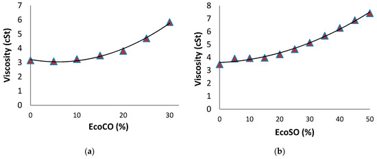 Kinematic viscosity values (cSt), obtained at 40 °C, of mixtures composed for (a) increasing amounts of castor oil ecodiesel (EcoCO) in fosil diesel, and (b) increasing amounts of sunflower oil ecodiesel (EcoSO) in fosil diessel.