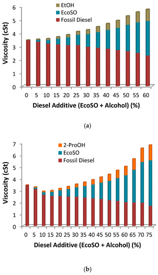 In Figure 3, the viscosity values of different triple blends Diesel/EcoSO/alcohol, are collected. Two different alcohols, ethanol and 2-propanol have been employed. First of all, it should be highlighted that the blends were prepared adding increasing amounts of a mixture of Ecodiesel/alcohol 4:1 (v/v). This 4:1 proportion has the maximum amount of ethanol for the blends to be stable, taking into account that the subsequent adding to diessel fuel will be further dilute the mixture (triple blends). Thus, these Ecodiesel/alcohol mixtures present a viscosity of 7.75 cSt with ethanol y 7.32 cSt with 2-propanol, so they cannot be applied as biofuels because of their high viscosity values (the diesel engine works at viscosities between 3–5 cSt, according to EN 14214). However, by adding different amount of diesel to these double mixtures, a sufficient reduction of the viscosity values was achieved, in the range of 3–5 cSt, which can be perfectly employed in a C.I. engine. Taking into account the viscosity results shown in Figure 3a, with a blend diesel/EcoSO/ethanol 60/30/10, it is possible to incorporate a 40% of renewable compounds as diesel additive, which is almost the double than that achieved with the blends diesel/Ecodiesel, where a maximum of 25% of EcoSO in diesel was obtained (Figure 2b). Regarding the data obtained with 2-propanol, Figure 3a, with only a 40% of diesel in the blend, we are able to obtain a biofuel with a suitable viscosity for being employed in C.I. engines, replacing a 5% more of diesel than using ethanol.