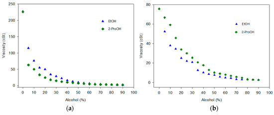 Viscosity values of the different double mixtures obtained blending ethanol (1.3 cSt) or isopropanol (1.63 cSt) with castor oil (227.0) cSt (a) and with the Ecodiesel from castor oil (EcoCO) (b).