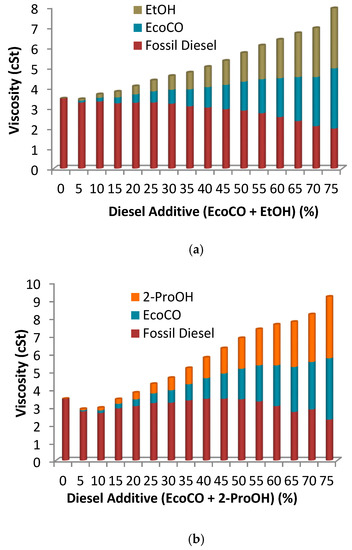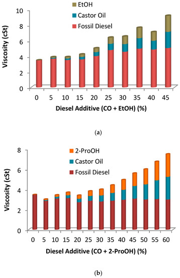 According to the results shown in Figure 5a, it is possible to incorporate a 40% diesel additive, e.g., 60/20/20 in the blend diesel/EcoCO/ethanol, so it is possible to achieve a higher substitution of diesel fuel than that achieved with the double blends diesel/Ecodiesel. Furthermore, no differences in the viscosity values obtained for the blends using either ethanol or 2-propanol were observed (Figure 5).