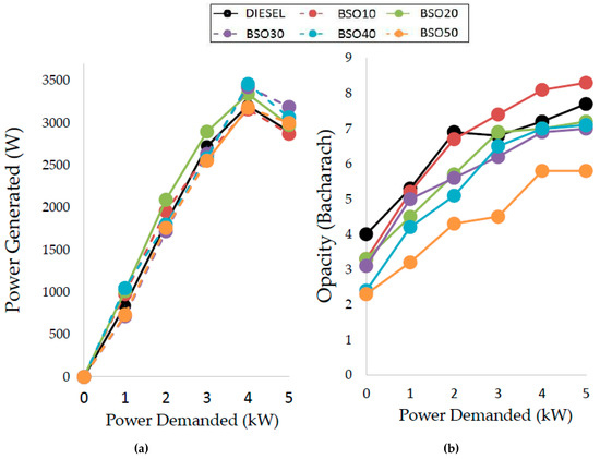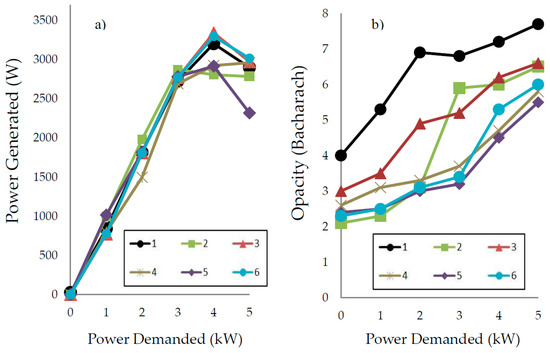 (a) Power generated values (in Watts), based on the power demanded (kWatts) and (b) Opacity values generated in the smokes (in Bacharach units) as a function of the power demanded of the blends of Table 5.
