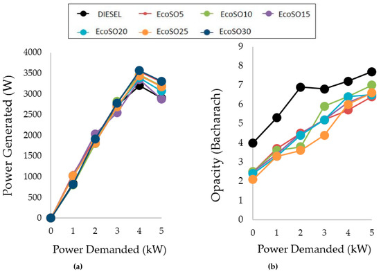 Results obtained by using different mixtures of Ecodiesel from sunflower oil with diesel fossil: (a) Power values generated (in Watts), based on the power demanded (in kWatts). (b) Opacity values generated in the smokes (in Bacharach units) as a function of the power demanded.