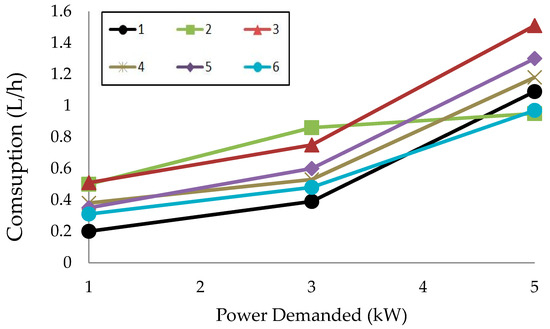 The consumption of the diesel engine with the different biofuels employed was calculated estimating the speed of consumption of the engine, with a given fuel, when operating under a determined demand of electric power.
