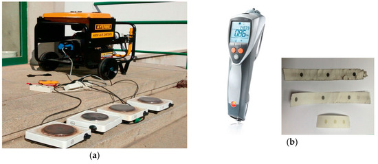 The mechanical and environmental characterization of a compression ignition diesel engine has been carried out, working at a rate of 3000 rpm coupled to an AYERBE electric generator, 5KVA, 230v type AY4000MN, for the generation of electricity, operating at a crankshaft constant rotation rate and under different degrees of demand for electrical power. This is achieved by connecting heating plates of 1000 watts each one (Figure 12a). This diesel engine will operate at a constant rate of rotation of the crankshaft and torque, so that the different values of electrical power obtained will be an exact consequence of the mechanical power obtained after the combustion of the corresponding biofuel. Different tests are obtained by providing to the engine double and triple mixtures of different biofuels in different percentages. The electrical power generated can be easily determined from the product of the potential difference (or voltage) and the electric current intensity (or amperage), equation (1), both obtained by means of a voltmeter-ammeter [45,46].