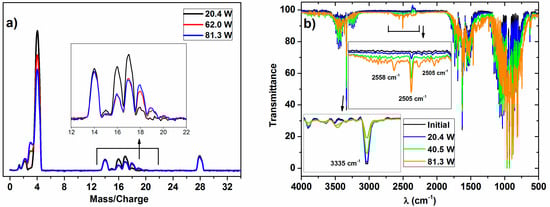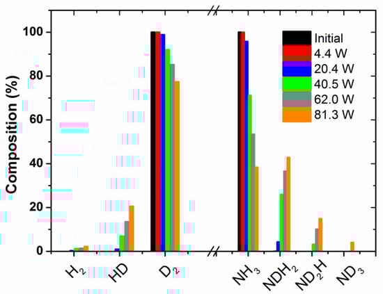 These MS spectra clearly show changes in the relative height of the peaks for the range of m/z values 0–4 (i.e., hydrogen–deuterium zone) and 13–20 (water and ammonia zones), which must be attributed to a progressively higher isotope exchange of H by D atoms at increasing powers. In concrete, the mass spectra reveal a clear increase of peaks at m/z = 3, attributable to HD, and others at m/z = 18 and 19, which must be attributed to NDH2 and ND2H (the fragmented ions are reported in Table 1). A minor contribution at m/z = 20, due to ND3 molecules, could also be found in the spectra of the mixture activated with the maximum power. Meanwhile, a decrease in the intensity of the m/z = 17 peak indicates a parallel decrease in the NH3 concentration in the outlet gases. In this set of experiments, no significant intensity change could be detected for the m/z = 28 (and m/z = 14) peak because of N2, a behavior indicating that the concentration of nitrogen remains constant, and that, therefore, practically no new ammonia (i.e., including all of the labelled NDxHy molecules) is formed according to Reaction (1) during plasma activation.